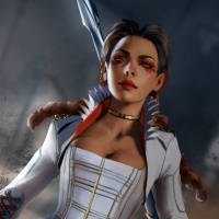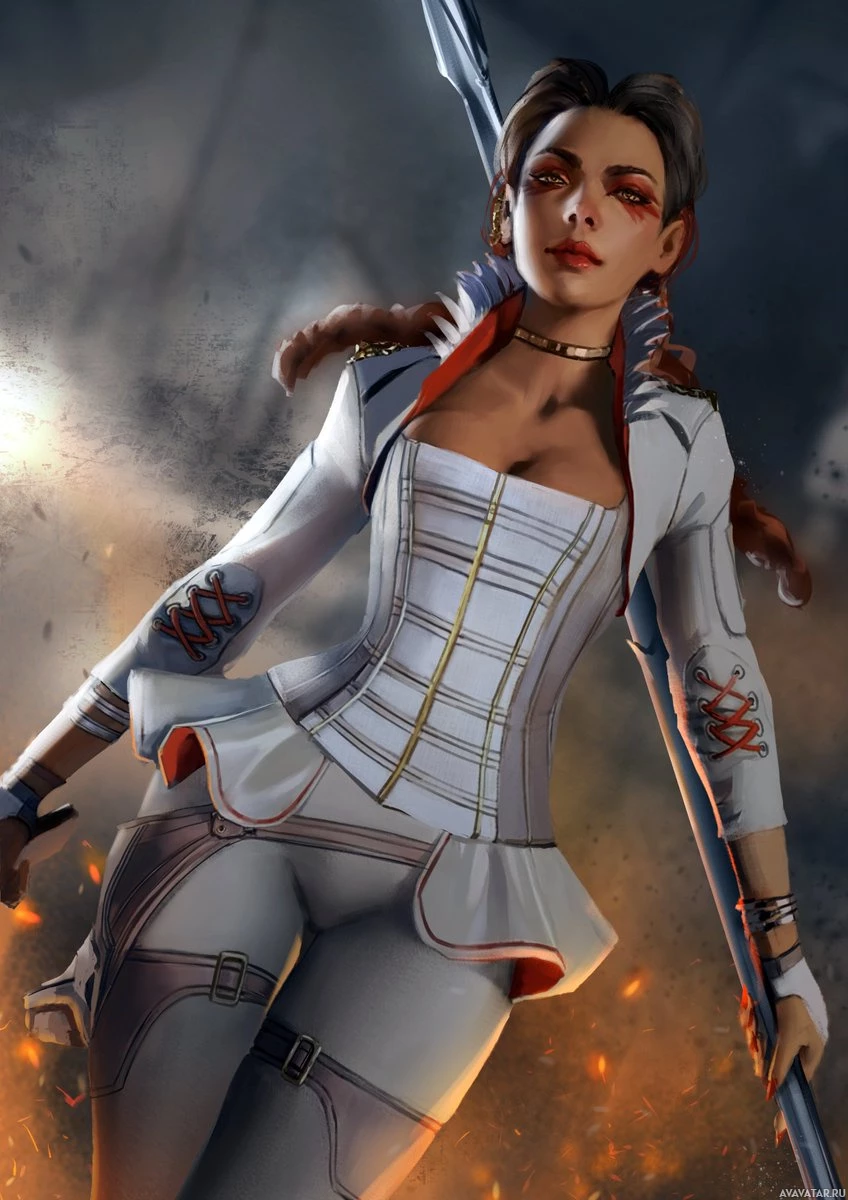 red accents around her eyes. The character is holding a weapon that looks like a staff or rod, which is characteristic of the game's futuristic theme.
