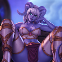 high heels. The character has long horns and ears, which are typical features of a draenei, a race known for their