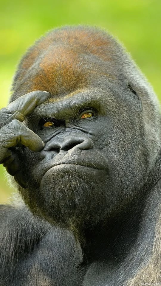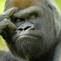This is a picture of a gorilla. It appears to be a gray and brown coloration, which is characteristic of the mountain gorilla subspecies, particularly those found in the Virunga Mountains region. Gorillas are known for their intelligence, strength, and social behaviors, often observed in captivity or in wildlife reserves where