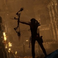 a video game character, who appears to be Lara Croft from the "Tomb Raider" series. She is depicted in silhouette and is seen holding a bow, ready for combat within what looks like
