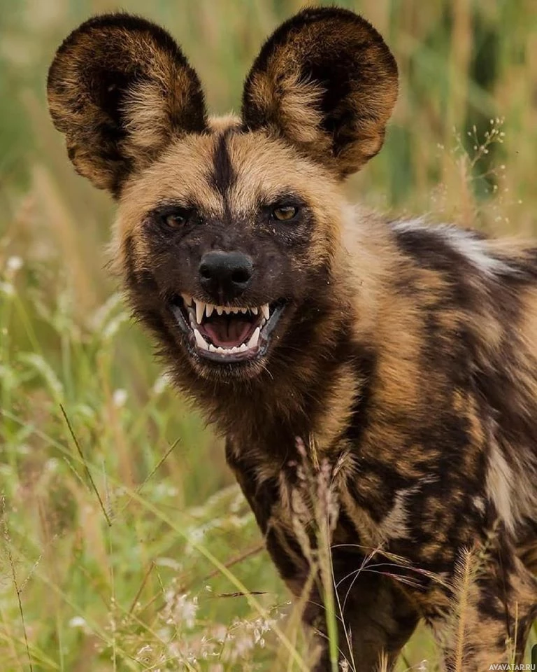 На картинке изображена гиена, стоящая в естественной среде обитания, вероятно, в саванне. Гиены известны своей характерной мордой с выступающими ушами и темным мехом с белыми или светлыми пятнами, что характерно для этого вида.
