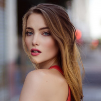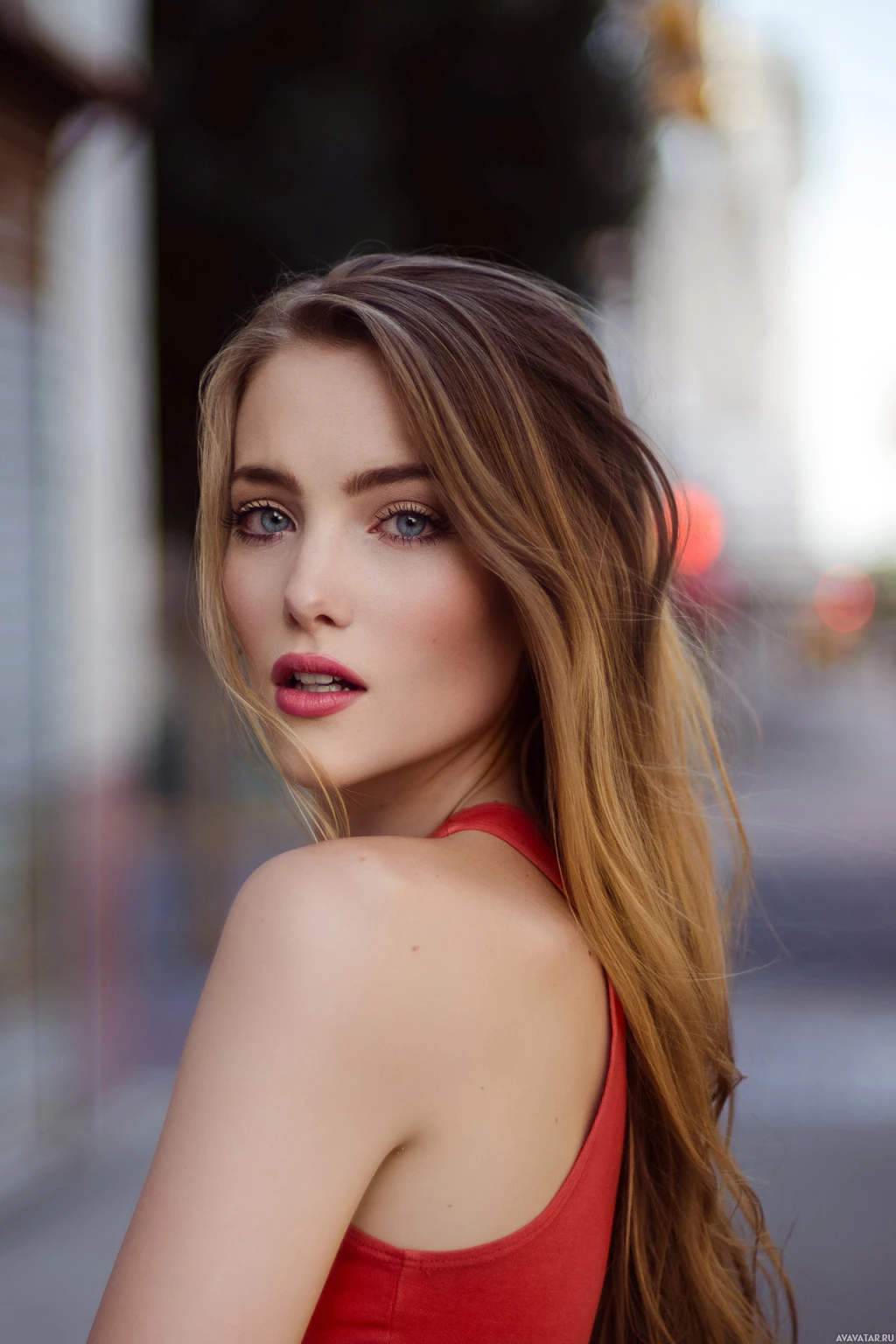 The image shows a woman looking away from the camera with her lips parted as if she is posing for a photo. She has long
