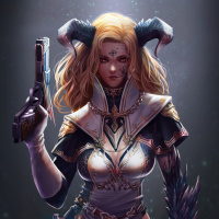 a blonde woman with horns, suggesting she might be portraying a devil or demonic figure. She is holding a pistol in her right hand, which adds to the dynamic and possibly mischievous
