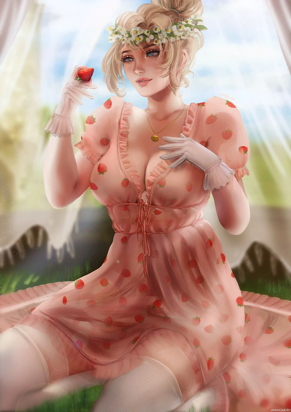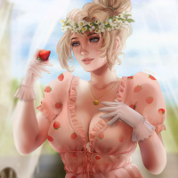 a strawberry sundae or smoothie. The character is wearing
