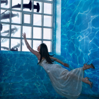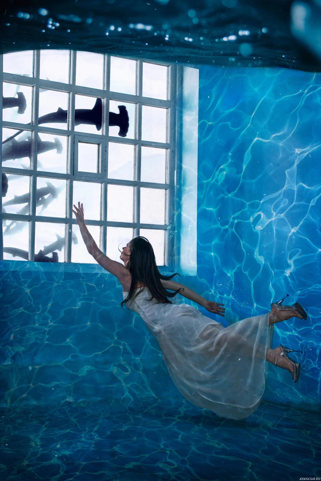 a white dress) contrasts with the typical underwater environment where one would expect to see scuba gear or flippers. It's a stylized artistic representation rather than a depiction of a real-