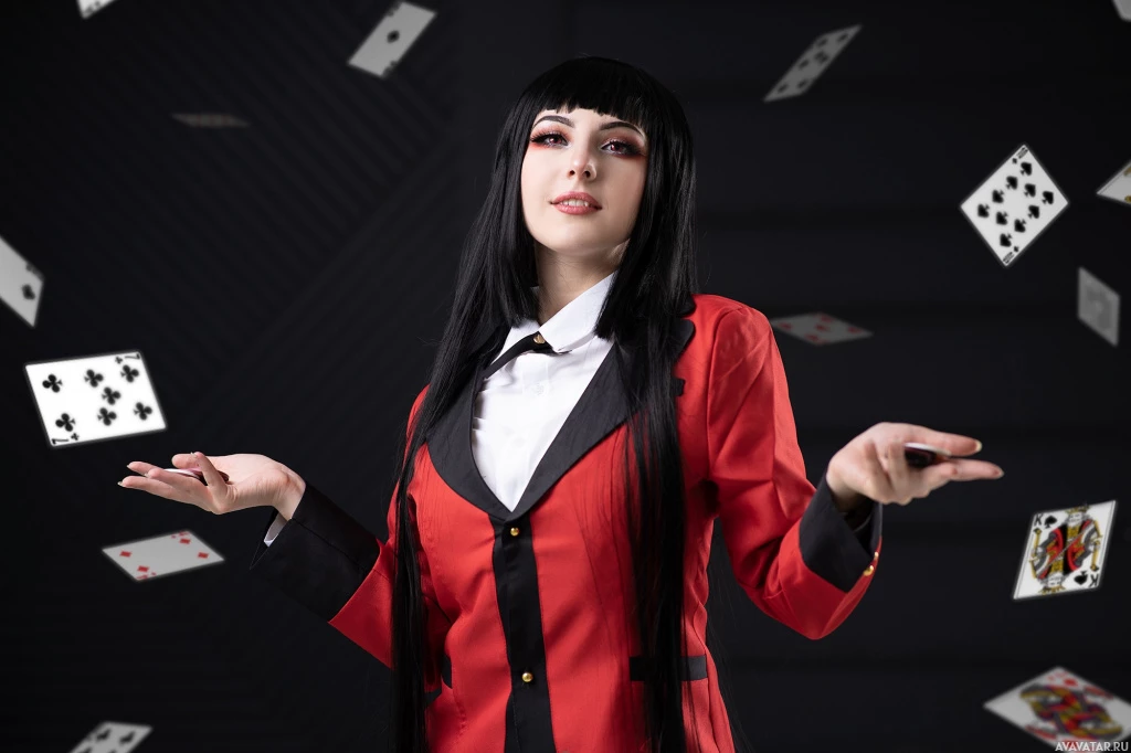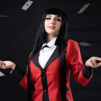 The image shows a person dressed in a distinctive style that is reminiscent of characters from anime or manga culture. They are wearing a red and black outfit that resembles traditional Japanese clothing, often associated with characters who represent luck or fortune, such as those found in games like poker or mahjong. The person has long