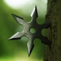 shaped object resembling a weapon, specifically a throwing star or a shuriken. It is resting against