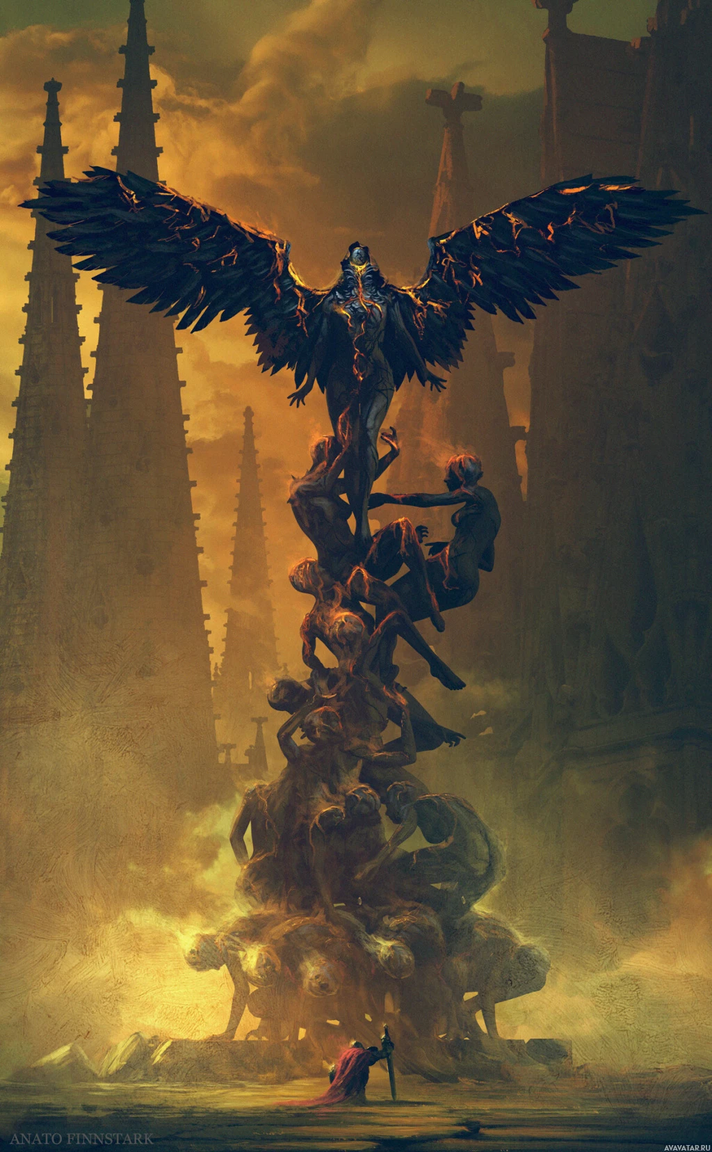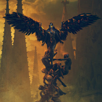black feathers, giving it an avian appearance. The creature stands atop