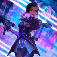 purple hair and is wearing futuristic armor, which is characteristic of Sombra's appearance in the game. She has a determined expression on her face and is holding what appears to be a weapon or device in her hand. The background features neon lights and a futuristic cityscape, fitting within the theme of "Overwatch," where