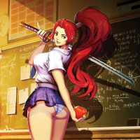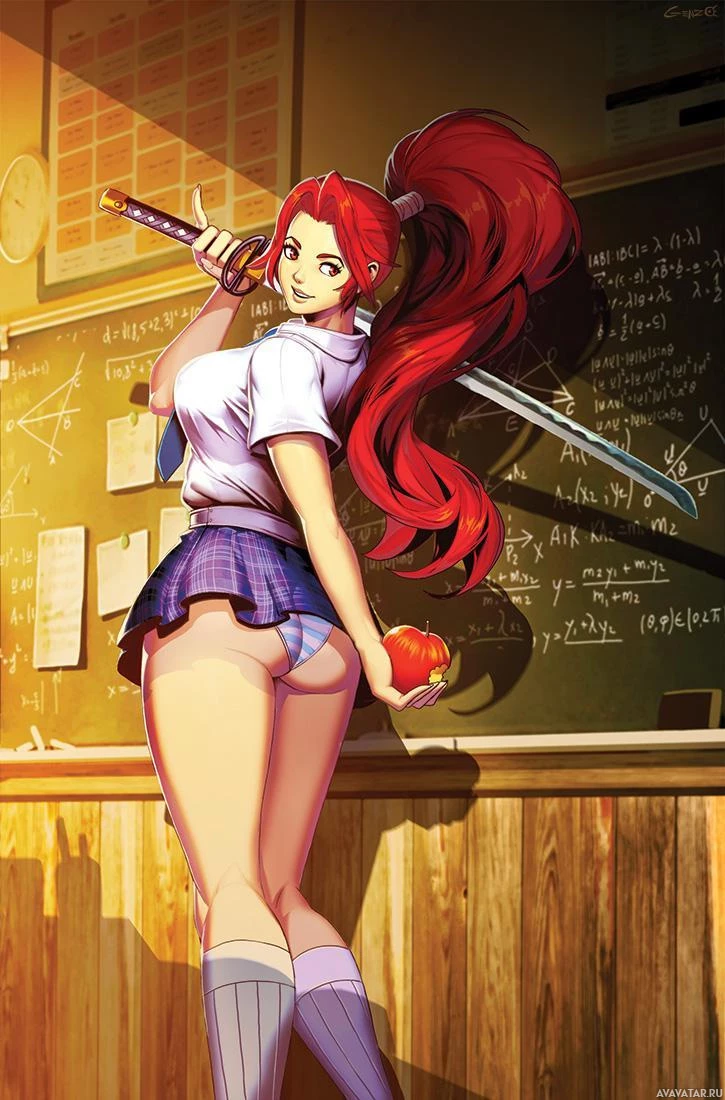 red hair. She is holding a sword in her hand and there is an apple near her. She appears to be standing in front of a blackboard, which suggests she might be in