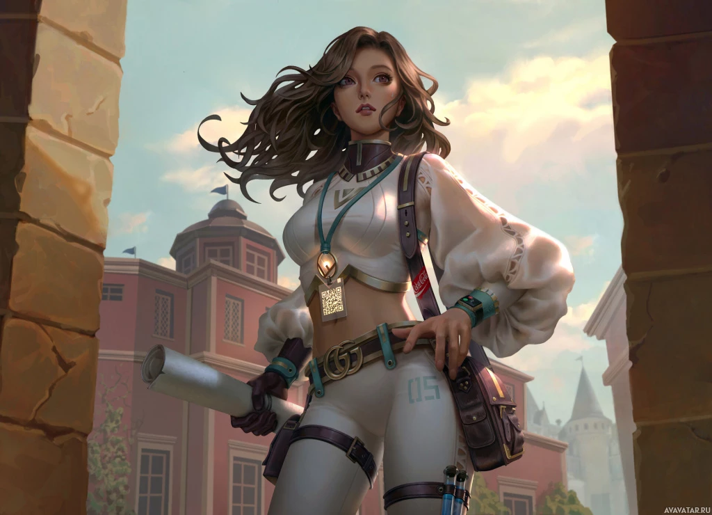 brown hair and is wearing a white top with some sort of armor or accessory on her left shoulder. In her right hand, she holds what seems to be a scroll or document, while in her left hand, she's holding a gun. The character has