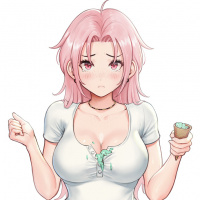 The image features an anime-style drawing of a girl with pink hair. She is wearing a white tank top and denim shorts, and she appears to be holding an ice cream cone in one hand and a spoon in the other. Her expression seems surprised or shocked.