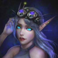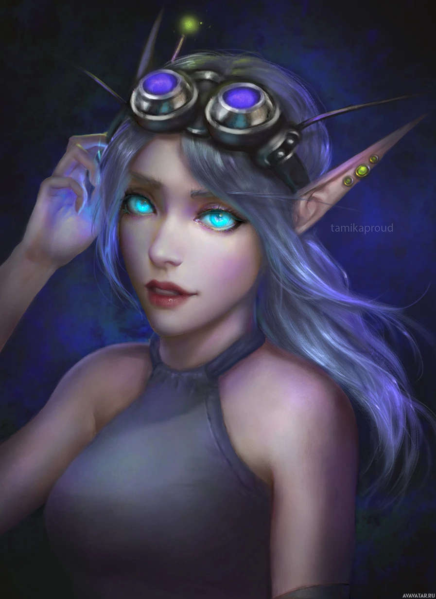 an animated character with features commonly associated with fantasy or elf-like creatures. This character has pointed ears, which is a characteristic often given to elves in fantasy genres, and they also have glowing