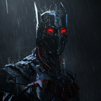 version of Batman, standing in the rain. He is wearing a suit that has a metallic and rugged appearance with elements that look like armor or