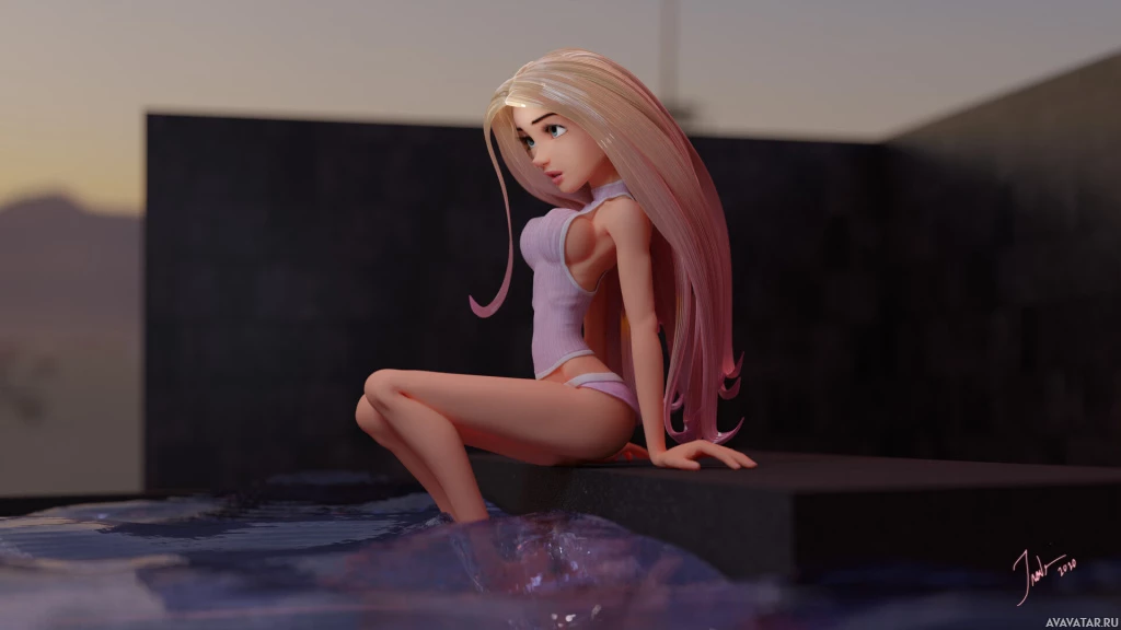 blonde hair. She is wearing a sleeveless swimsuit and is seated by the edge of what looks like a swimming pool during sunset or sunrise, given