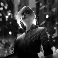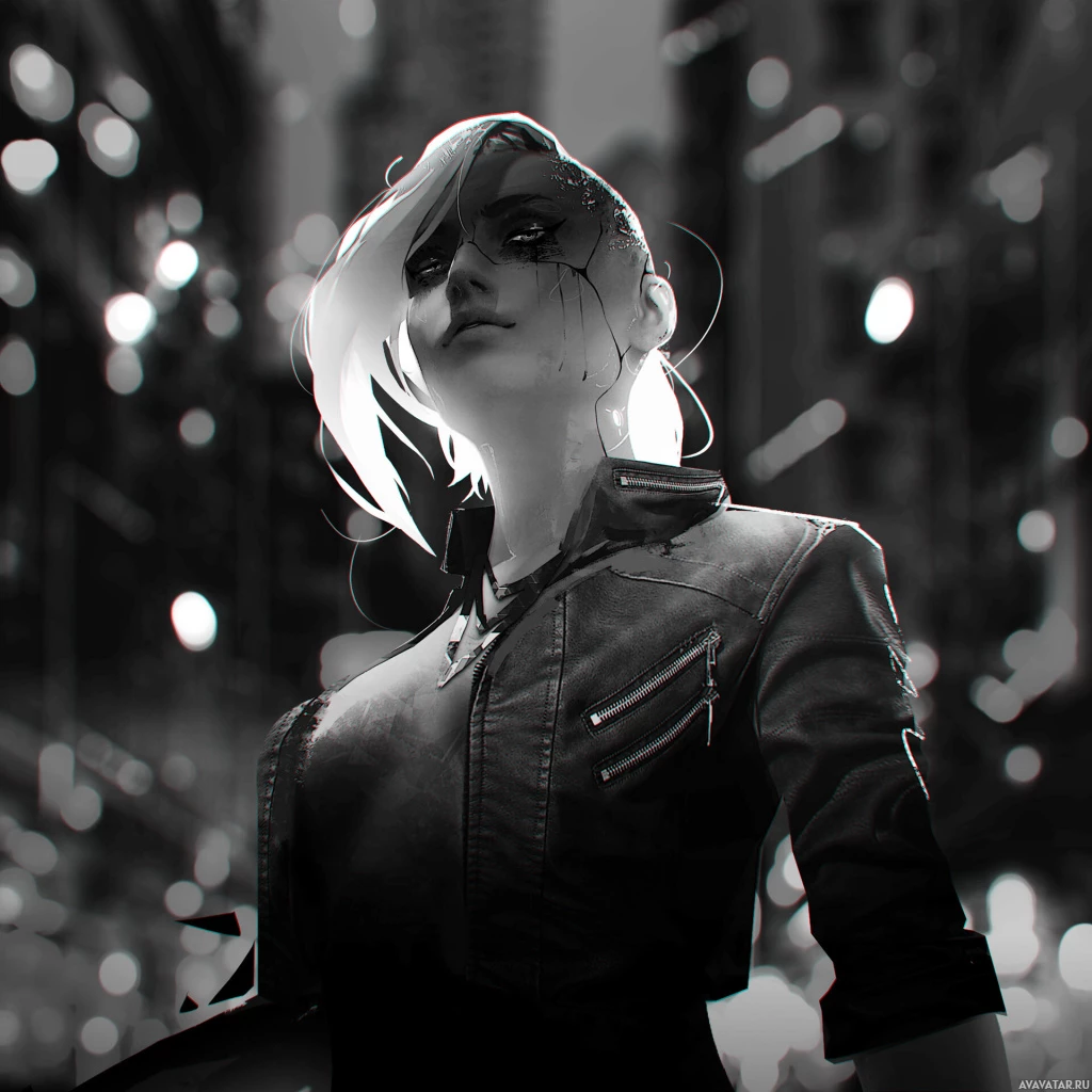an urban environment at night, as indicated by the blurred city lights around her. The image has been processed with