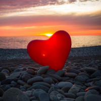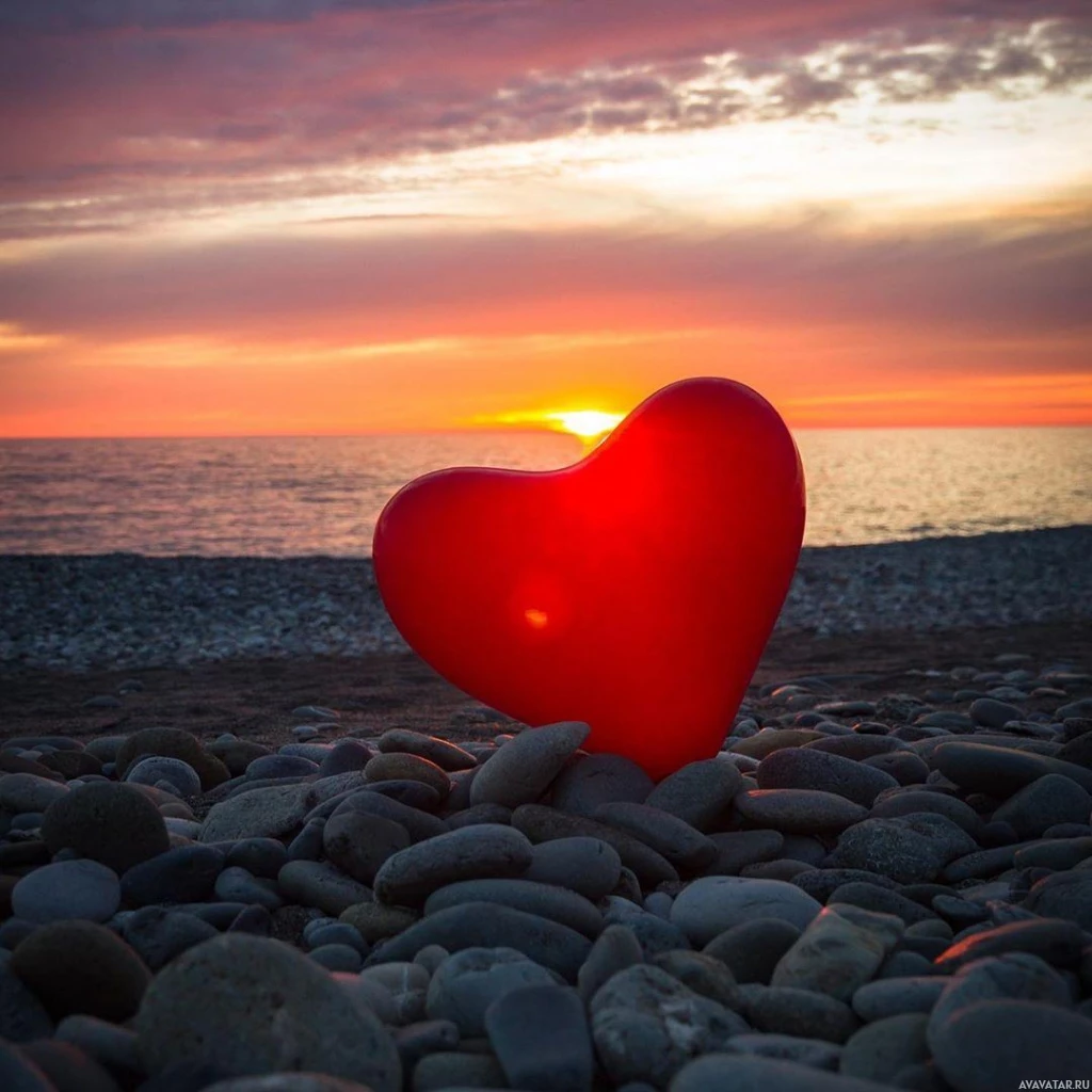 На картинке изображен объект в форме сердца, расположенный на галечном пляже на закате. Небо окрашено в теплые тона, что указывает на конец дня и начало ночи. Береговая линия кажется безмятежной, что наводит на мысль о том, что это может быть безмятежное место для спокойных моментов или выражения любви.