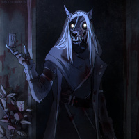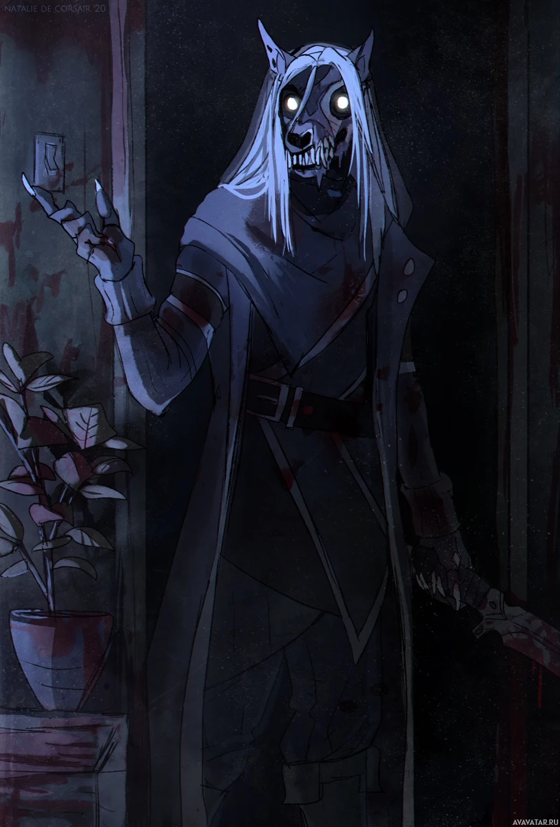 a pale face and glowing eyes that give off a creepy vibe. The background suggests a dark, possibly abandoned or neglected place, which adds to