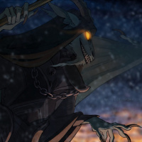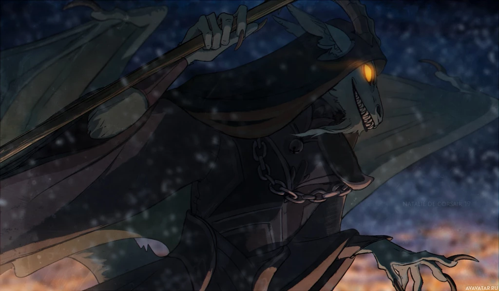a full moon and dark sky, which adds to the eerie atmosphere of the scene. The artwork has a fantasy or supernatural vibe, commonly associated with