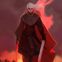 На картинке изображен персонаж женского пола с белыми волосами, одетый в одежду в средневековом стиле. В одной руке она держит меч, а за спиной у нее развевается красная накидка. На заднем плане изображена сцена битвы с хаосом вокруг, возможно, указывающая на конфликт или военные действия.