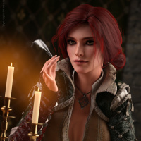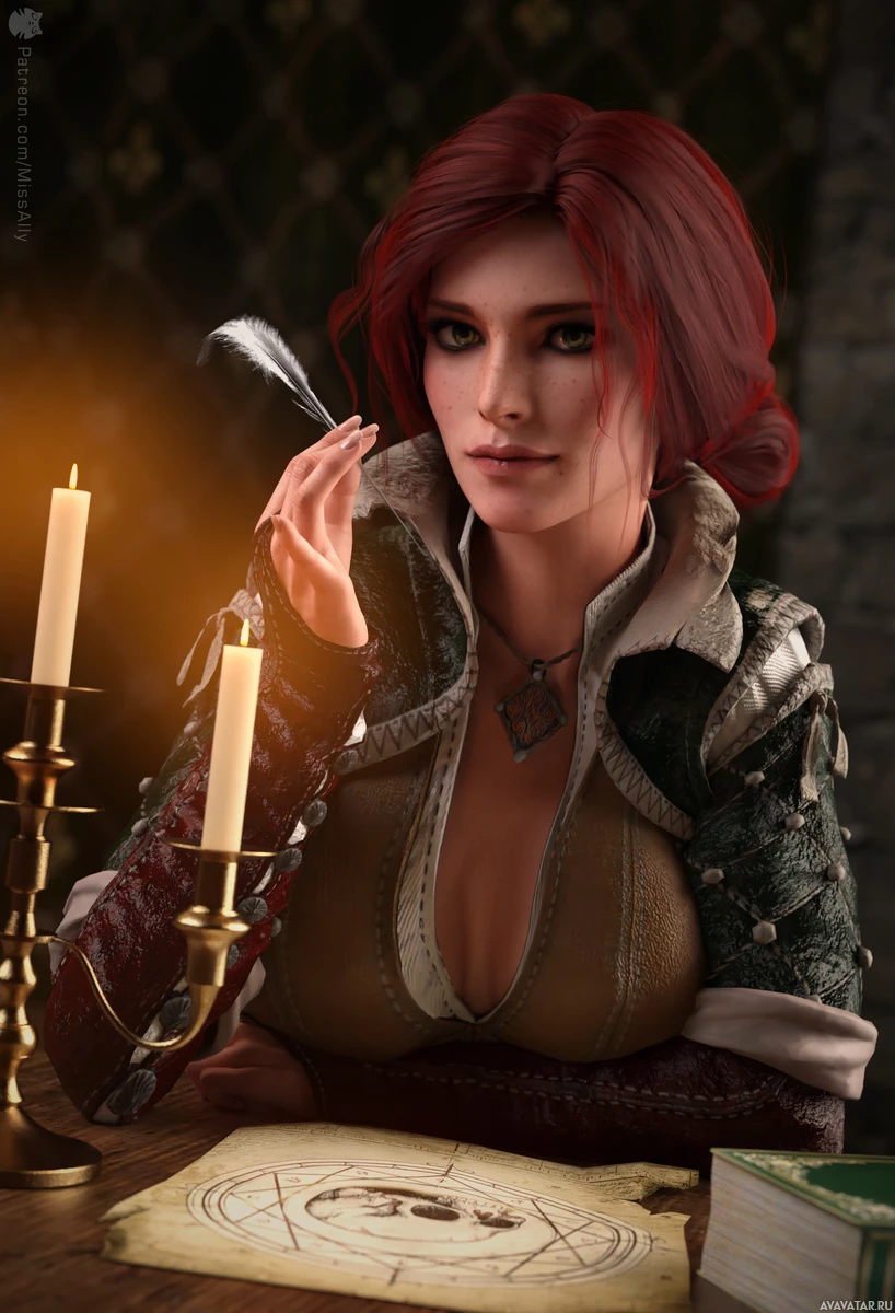 video game series, specifically Triss Merigold. She is depicted sitting at a desk with candles and what looks like