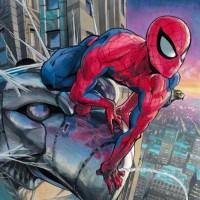 an action pose, swinging through the air amidst the backdrop of a city skyline. It appears to be a dynamic and vibrant artwork that captures the essence of