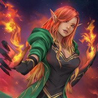 fantasy world. In her hands, she holds two flames, one on each palm, indicating that she has the ability to control fire. The background includes fiery elements and what appears to be a magical or mystical atmosphere, which fits well with