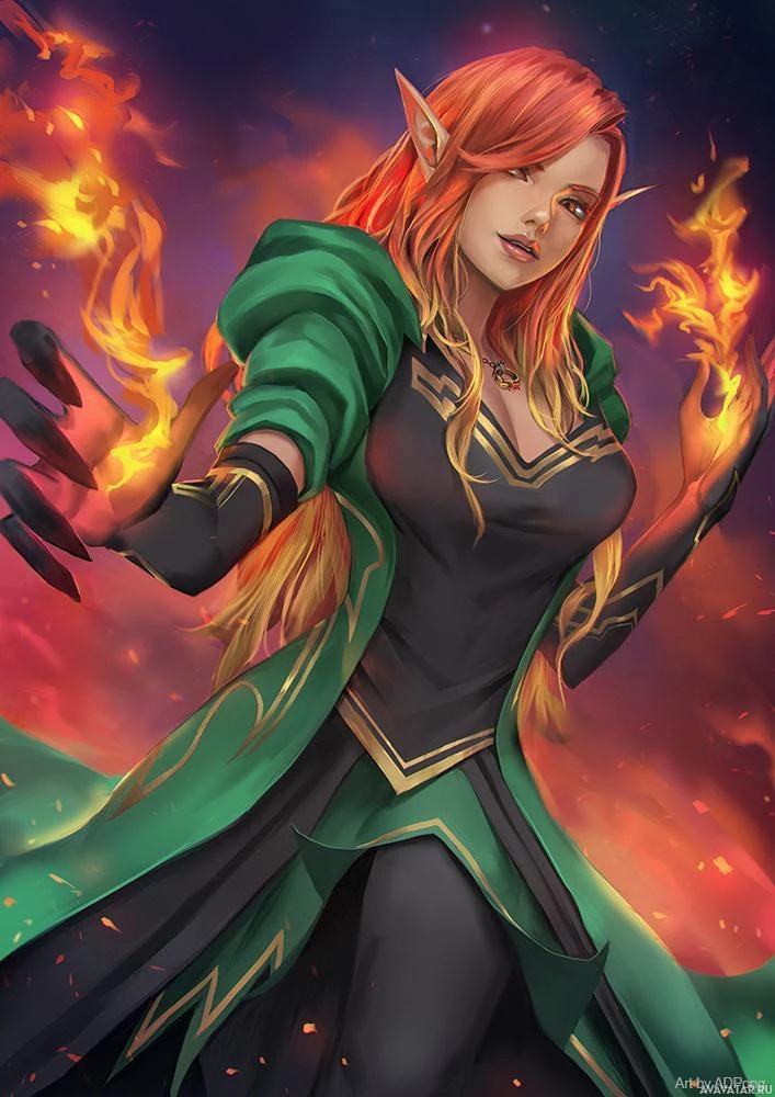 red hair and pointed ears, which are common features of elves in fantasy genres. She is dressed in a green cloak with gold accents, suggesting she might have some kind of status or role within her