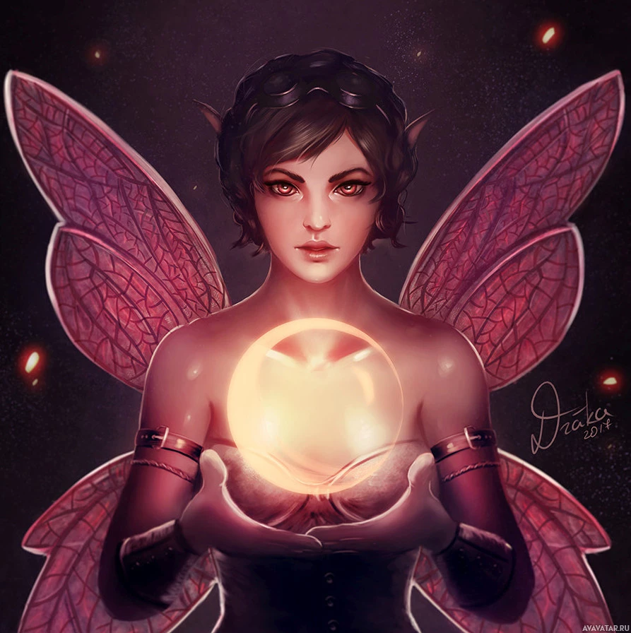 pointed ears and wings, and is holding a glowing orb or ball in their hands. The setting appears to be dark with possibly