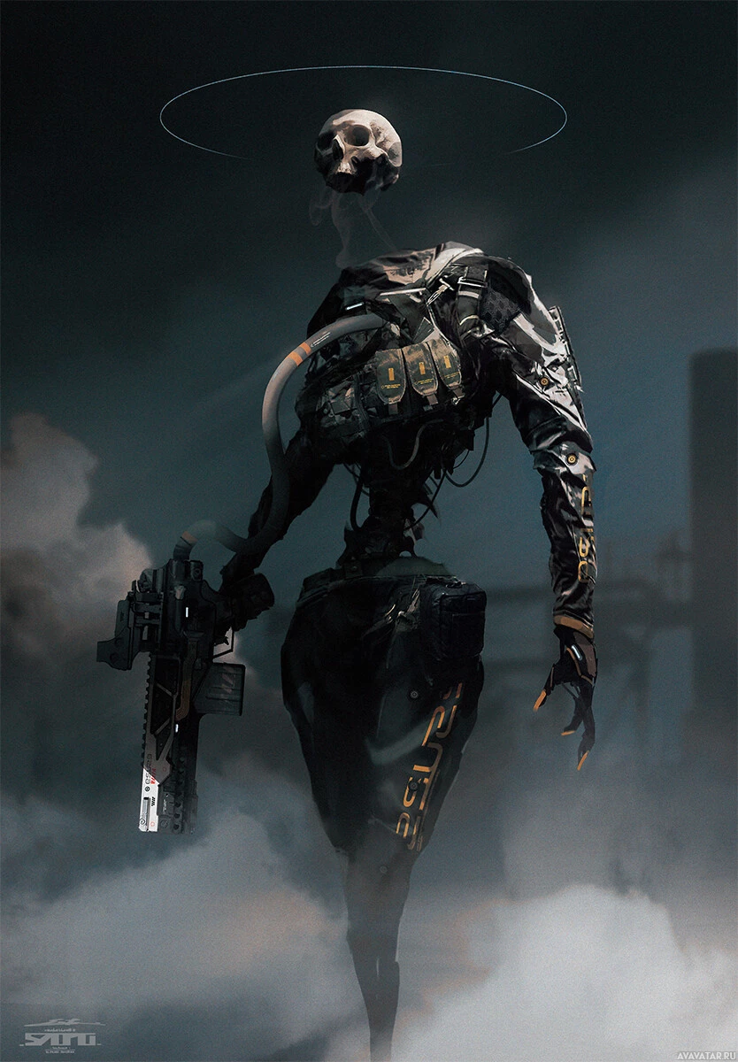 an assault rifle, indicating that it may be designed for combat or military applications within this science fiction context. The artwork has an ominous feel due to