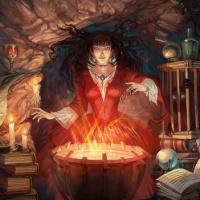 various objects around her, suggesting she might be practicing some form of magic or sorcery. There are books open on the table in front of her, which could indicate a study of