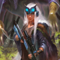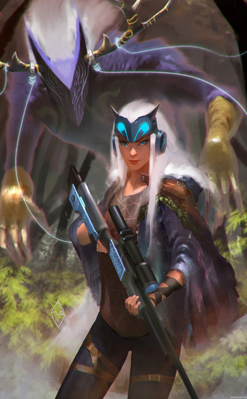 white hair and blue eyes, holding a gun. She is wearing what appears to be a costume or armor, suggesting she may be from a fantasy or science