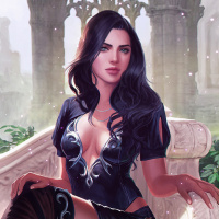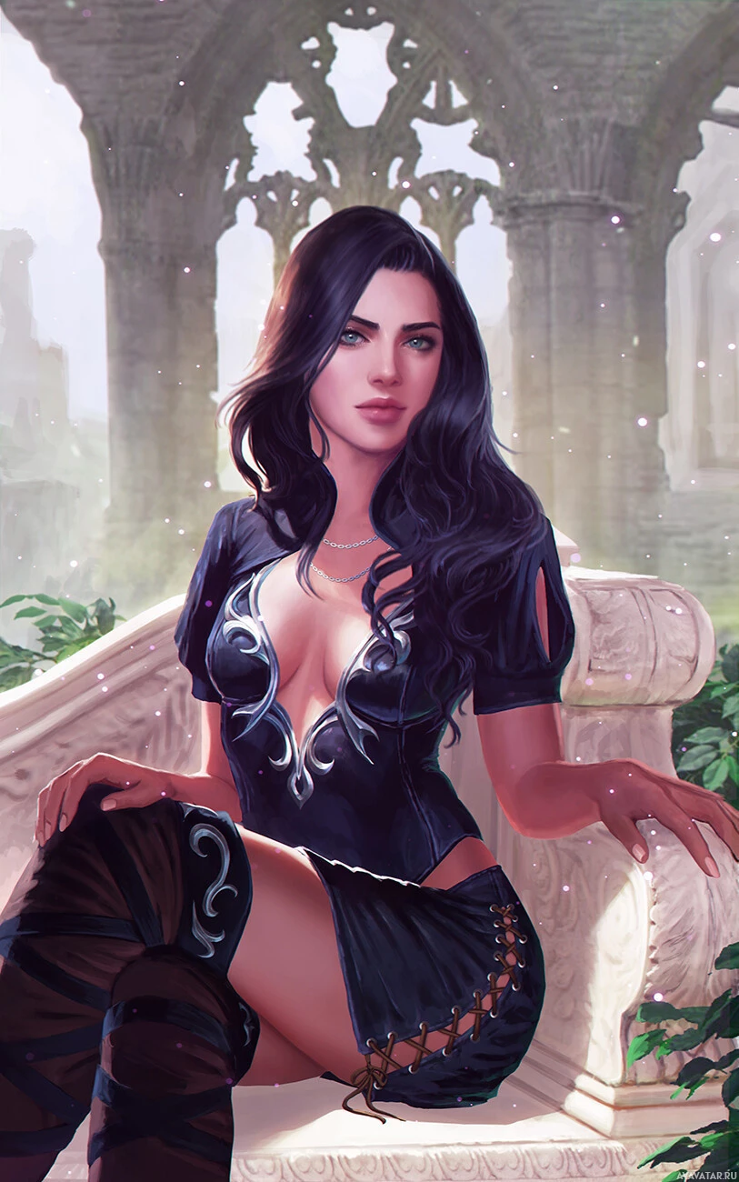 a black top with some intricate detailing, and she has accessories such as a necklace and a belt that seem to be part of her character's design. The overall atmosphere suggests an adventurous or fantastical context typical of such media.