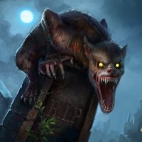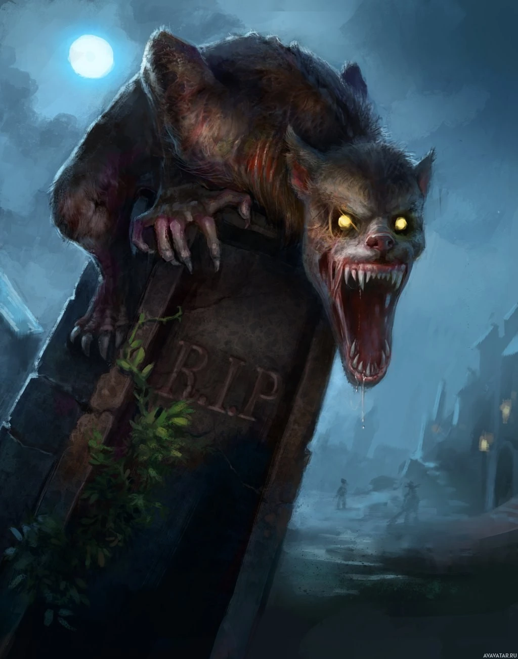 snarling expression and is situated on a grave with the inscription "RIP." The setting appears to be during the night under
