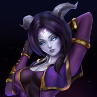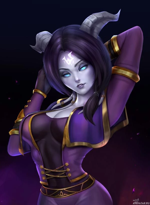 an animated character, likely from a fantasy-themed game or series. This character has horns and is styled in a purple and gold outfit, which could suggest a connection to