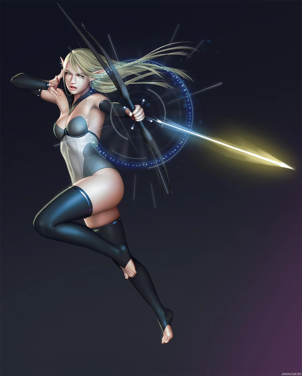 The image shows a fantasy-themed character, which appears to be an elf, holding a bow. The elf is depicted in mid-motion, possibly running or jumping with the bow drawn back and ready to fire. The art style suggests it could be from