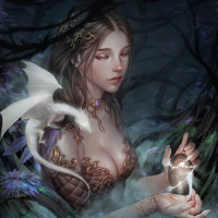a small dragon, which she seems to be holding or interacting with. The environment around them is rich and verdant, with misty lighting that adds