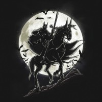 a full moon with bats flying around them. This scene is commonly associated with Halloween or fantasy adventure genres, often representing the figure as a knight or heroic figure against the backdrop of