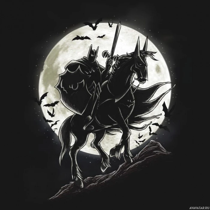 The image features an illustration of a character resembling Batman riding on the back of a horse under