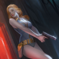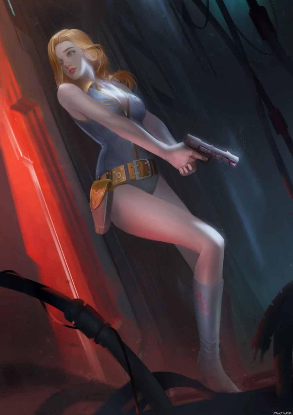 a female character with blonde hair, wearing a sleeveless outfit that appears to be a combination of a bodysuit and short pants. She is holding a handgun, which she points towards the viewer. Her expression is intense or focused, and she has her right hip cocked as if she's ready to fire. The background suggests an alien or sci-fi setting with