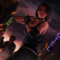 a city street at night during a chaotic situation, possibly suggesting a scenario where the character is defending herself against a horde of undead creatures.