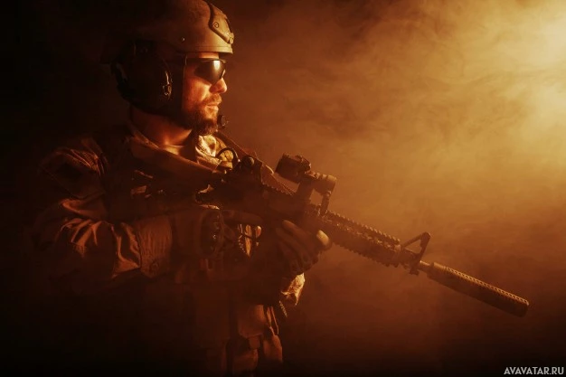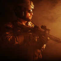 military gear, including a helmet and a firearm. The soldier appears to be in a combat or operational scenario given the tactical attire and the environment's muted lighting, which suggests a setting that might be used for