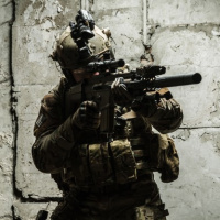 military gear, including a helmet and a vest with additional equipment. They are holding what appears to be