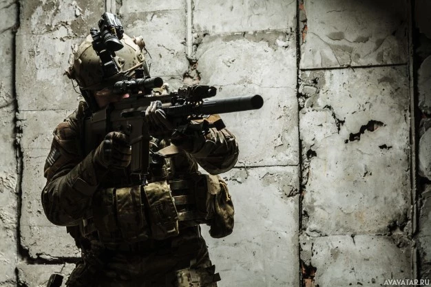 tactical scenario. The image is likely associated with themes related to military or action genres, and could potentially represent a character from a video game, movie, or documentary portraying