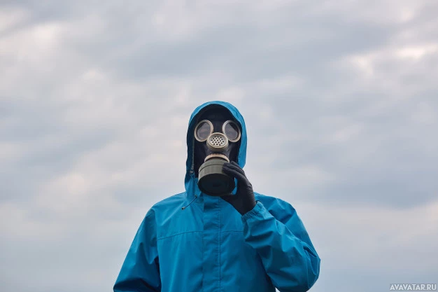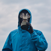 a respirator mask. The individual is also wearing a raincoat to shield from the elements. In one hand, they hold up what appears to be a device or meter of some sort, possibly for monitoring or measuring purposes. The background is nondescript with overcast skies suggesting