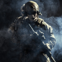 The image features a soldier in military gear, holding what appears to be a firearm. The soldier is standing in an environment with smoke or dust, which gives the scene a dramatic effect.