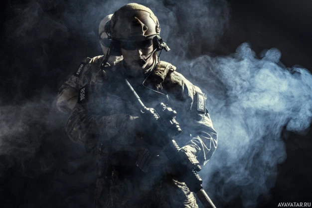 На картинке изображен солдат в военной форме, держащий в руках предмет, похожий на огнестрельное оружие. Солдат стоит в окружении дыма или пыли, что придает сцене драматический эффект.