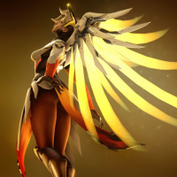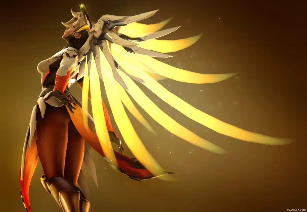 the video game "Overwatch." This character is known as Mercy, and she has wings that are spread out behind her. The setting appears to be