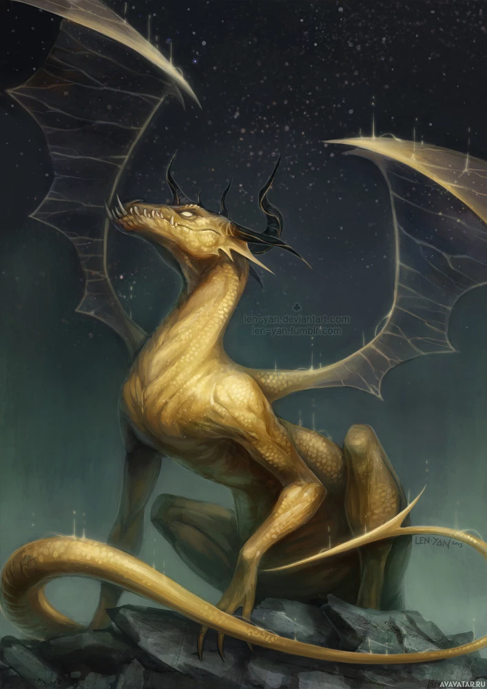 the body of a snake with scales and wings that extend from its back. The dragon is perched on what appears to be rocks or a rocky outcropping, set against a backdrop of a starry
