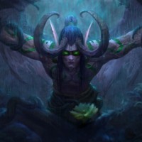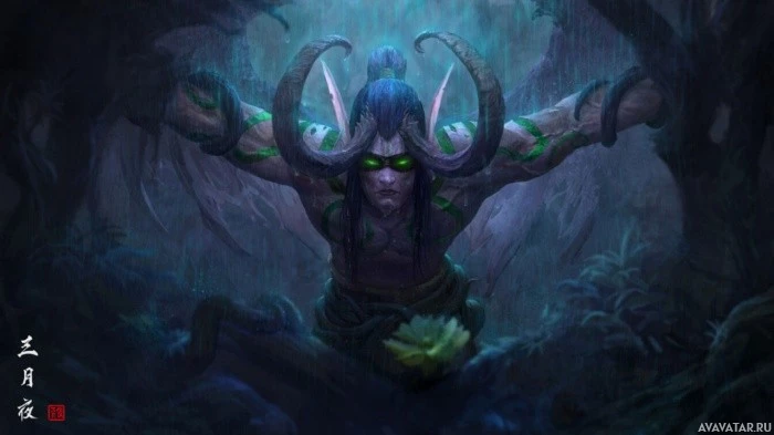 the Warcraft universe. This character is styled in a way that resembles traditional Chinese art, with calligraphy on either side of the image. The central figure has large, intimidating horns and